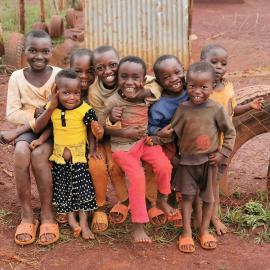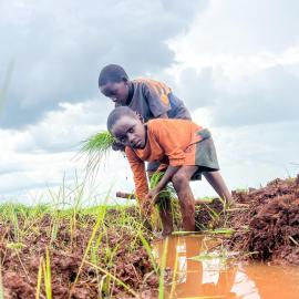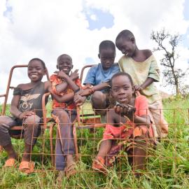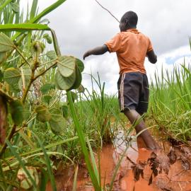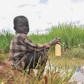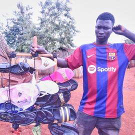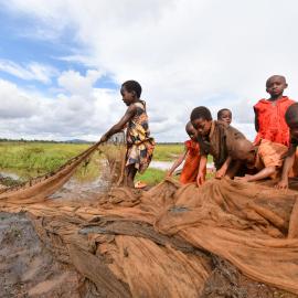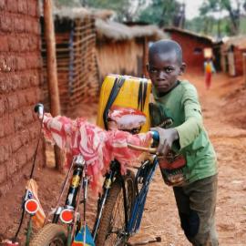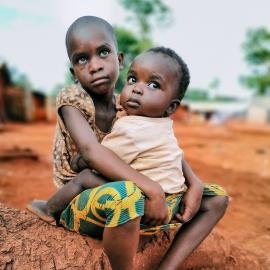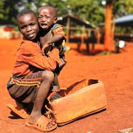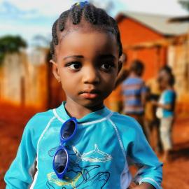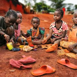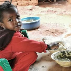 Little girl Aziza has dinner with little corn fufa and little fry with cassava leaf. While her older sister was eating, Aziza was sleeping and it was not possible to call her to the table to eat with her sister. They used to eat together, her mother explained to me that Aziza had no appetite when she eat at the table alone, but today Aziza eats with gusto.
