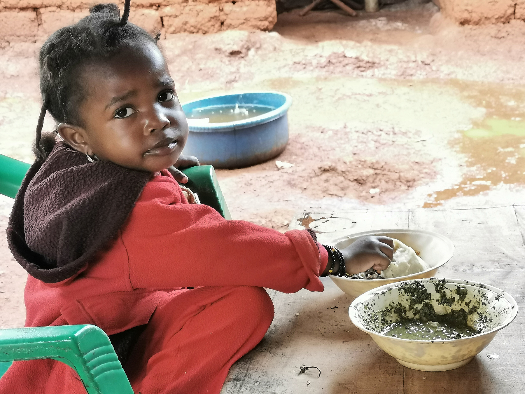 Little girl Aziza has dinner with little corn fufa and little fry with cassava leaf. While her older sister was eating, Aziza was sleeping and it was not possible to call her to the table to eat with her sister. They used to eat together, her mother explained to me that Aziza had no appetite when she eat at the table alone, but today Aziza eats with gusto.