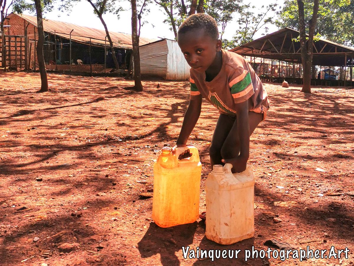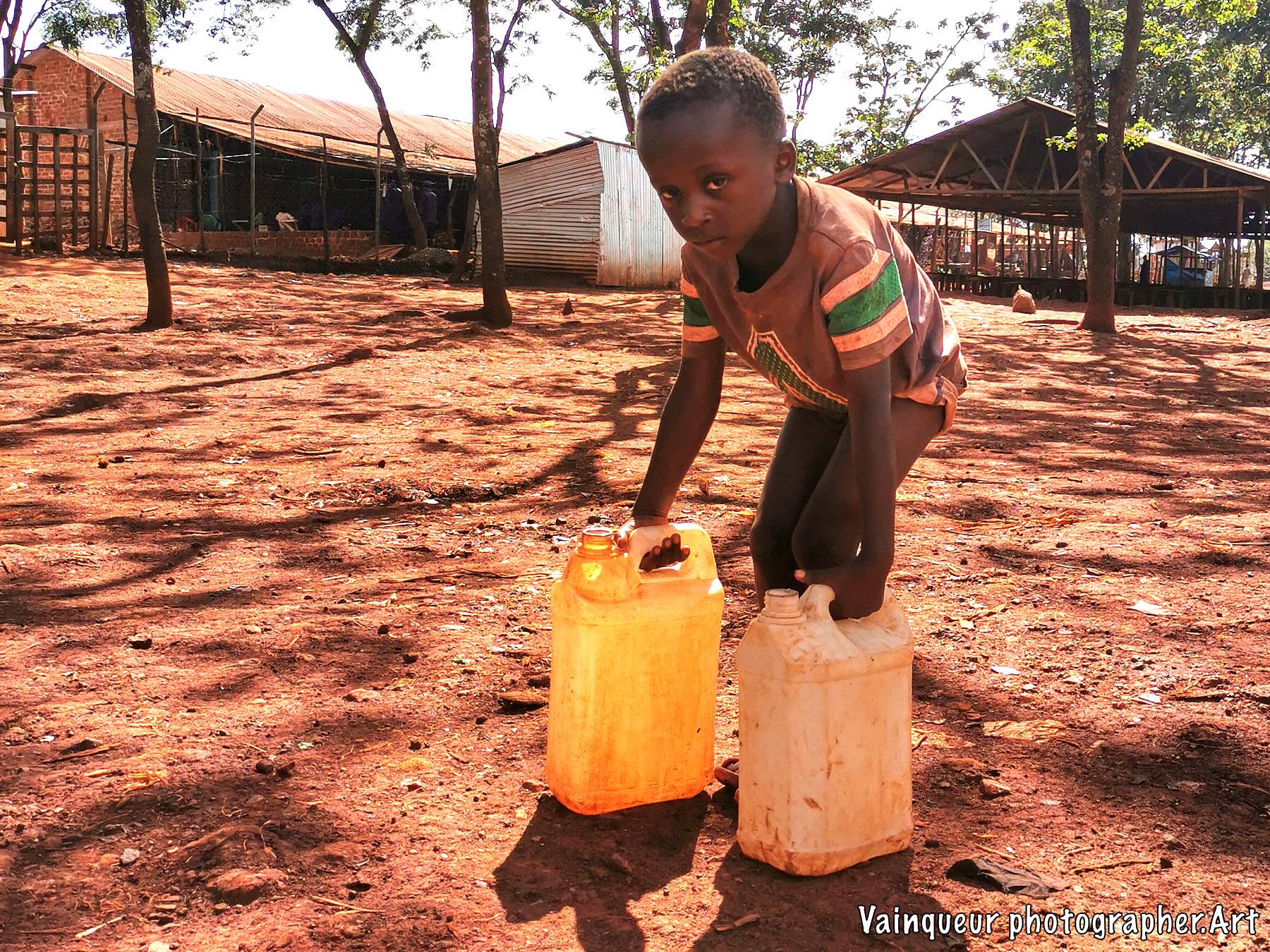 This little boy is coming from the pump which is a few meters from his home. This brave little boy has taken care of the water while his sisters went to the WFP depot to receive food and his brothers went to school. So this boy has gone to bring the water.