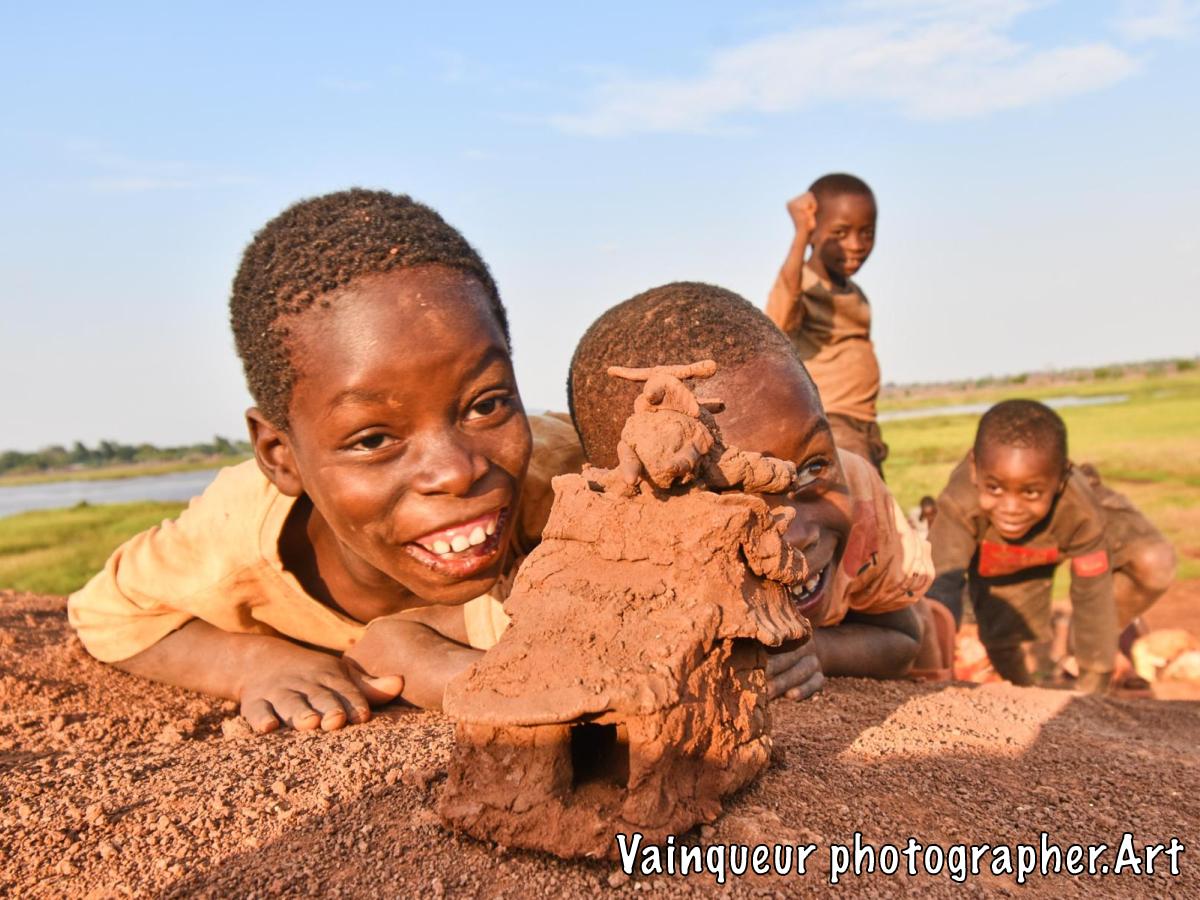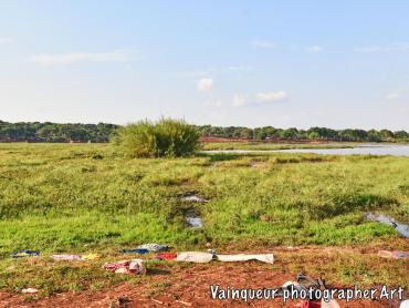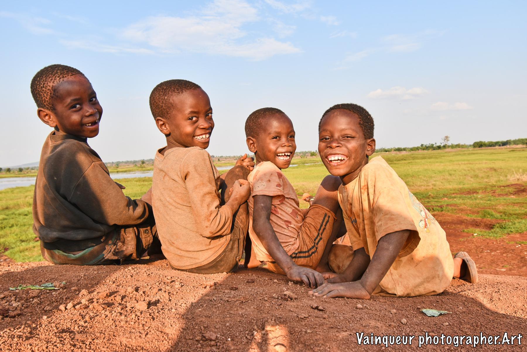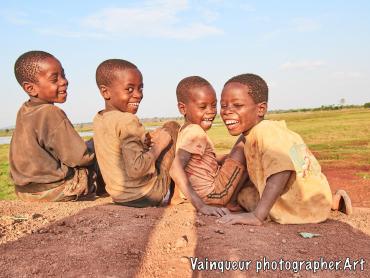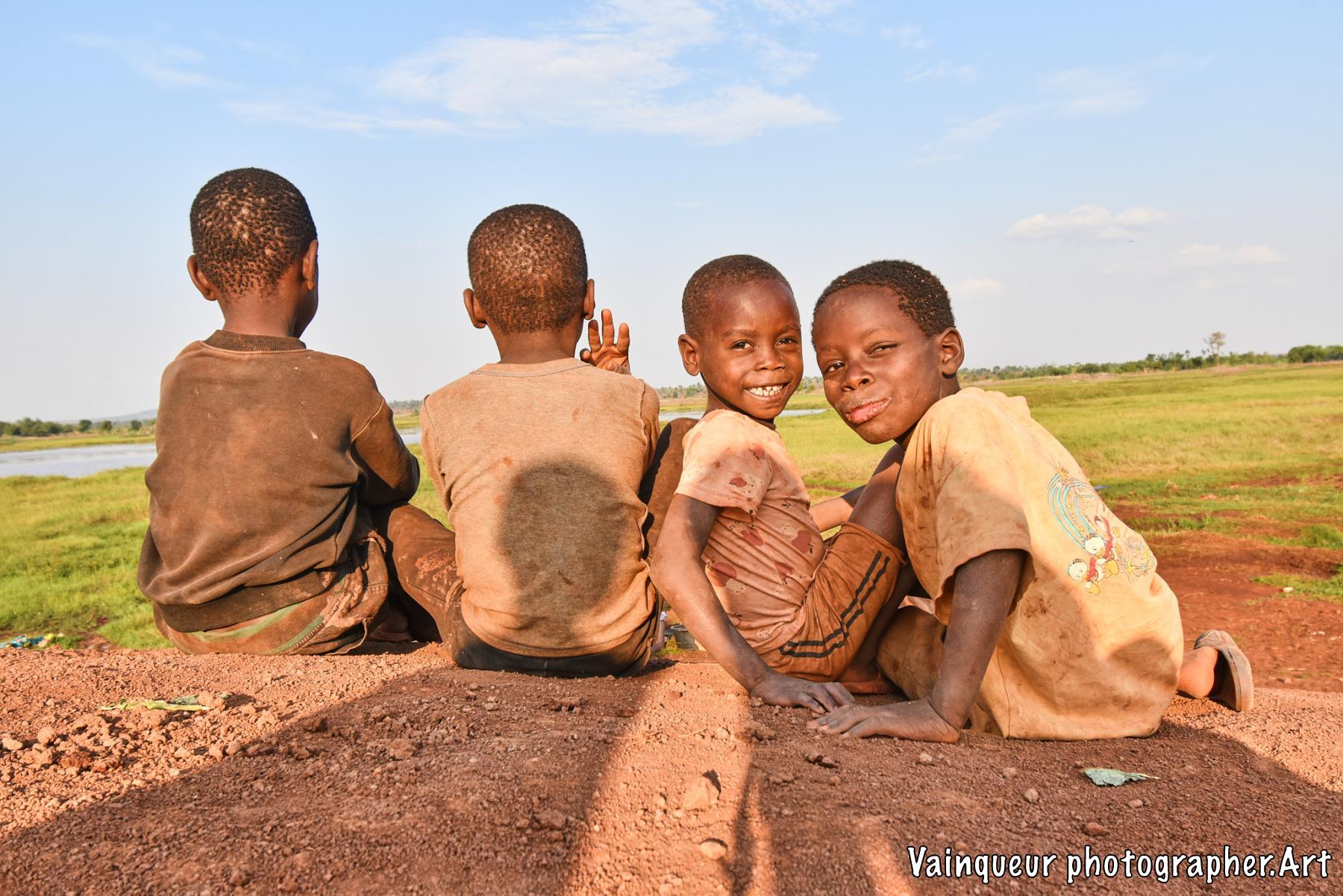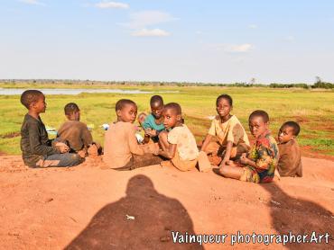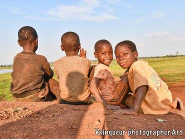 Somewhere in the village of Nyarugusu children relax and enjoy the fresh air in the sunshine near a stagnant pool of water.