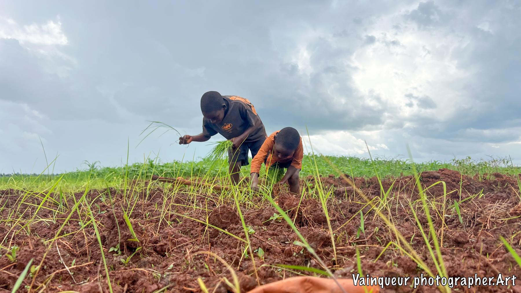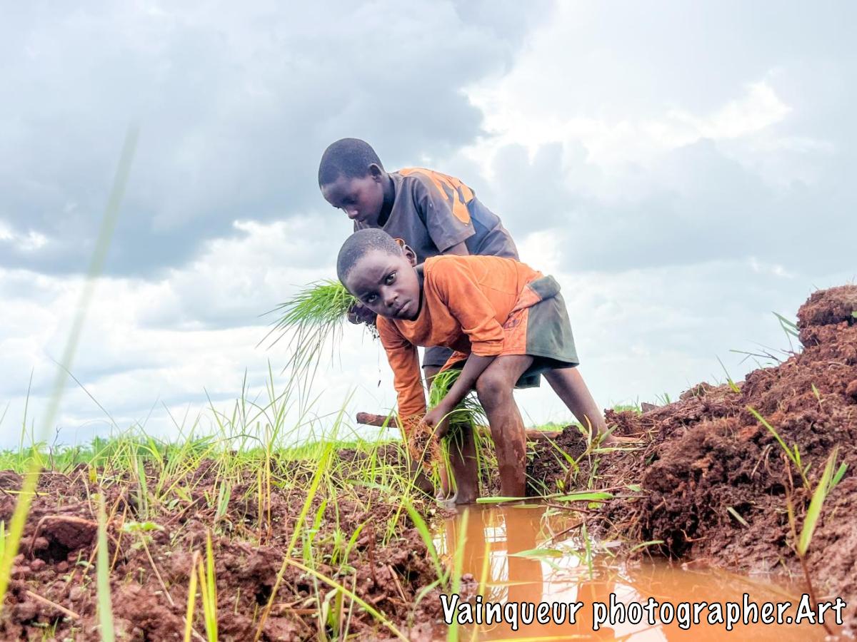 In the heart of the countryside, under a vast sky heavy with clouds, two young children bend low over the wet soil—planting rice with steady hands and quiet determination. This is not just farming; it's survival, tradition, and responsibility passed on too early. Their small fingers carry the weight of daily bread in many rural communities. While most children their age are in classrooms or at play, these two work the land—reminding us of the harsh realities many children face across the globe.