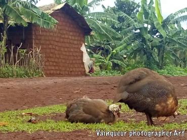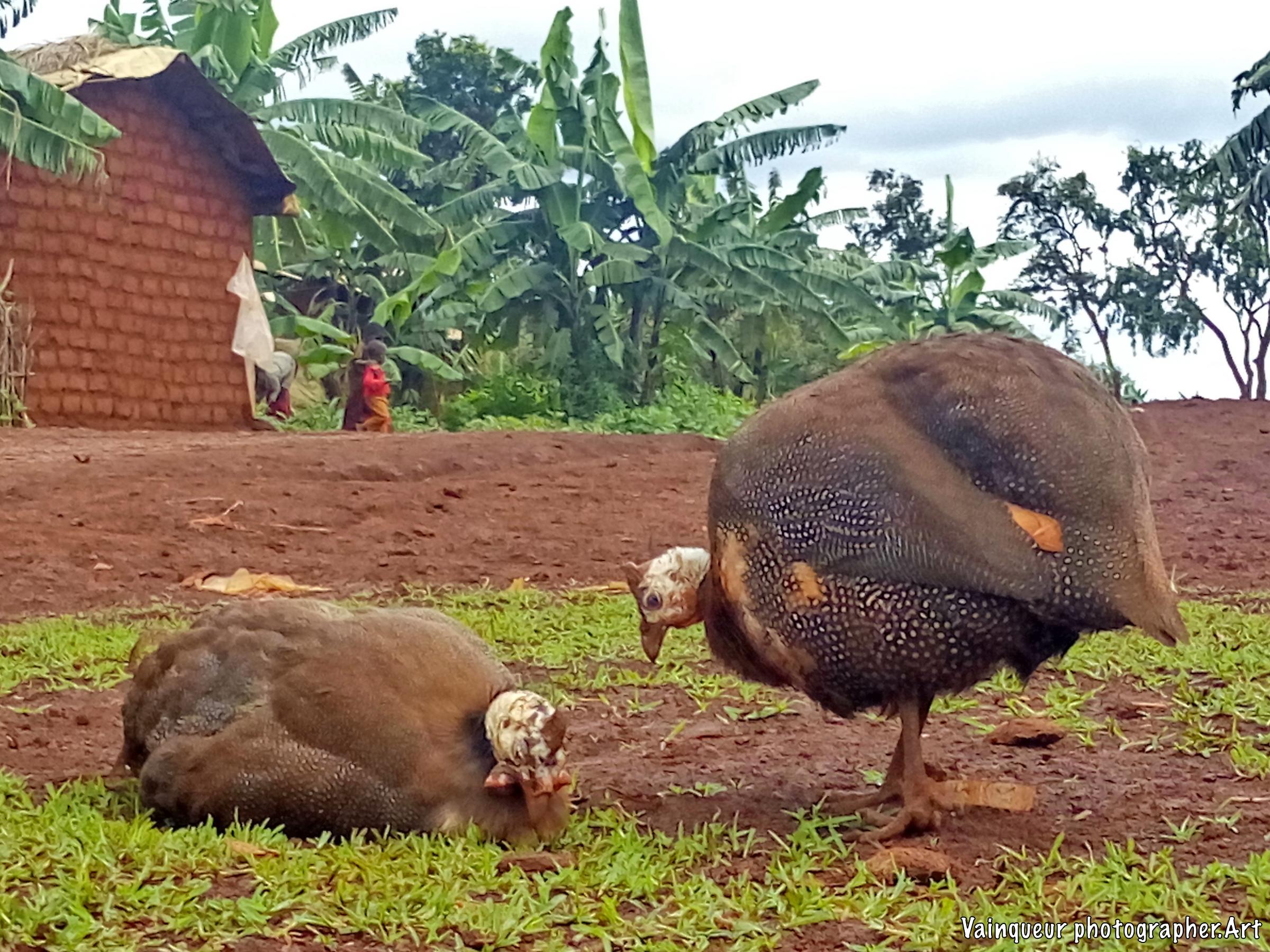 Some guinea fowls are found in zone 10 Nyarugusu camps in front of the house of a Burundian refugee. These guinea fowls feed on seeds as well as worms and ants.