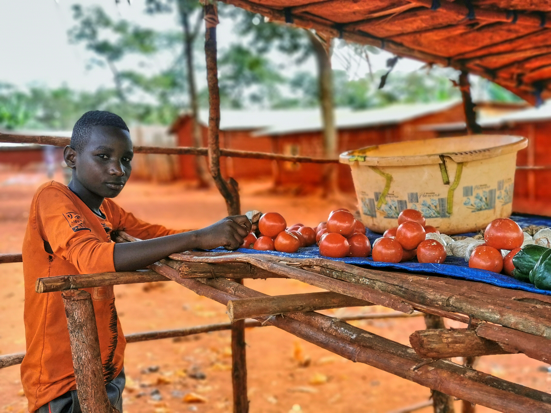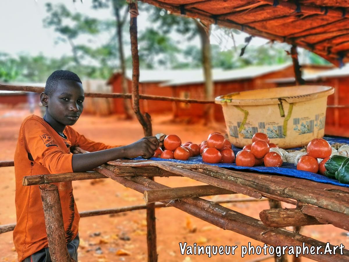 In this photo, there is a little boy named Olivier, he is a student at the Fraternity School. Because his mother had left, leaving him the goods for sale, so that she can go shopping on her own. Olivier explains how it works: ''We sell 4 tomatoes for 500 TZS and our customers are proud of this price, our pack of tomatoes is almost sold, so my mother left to buy others.