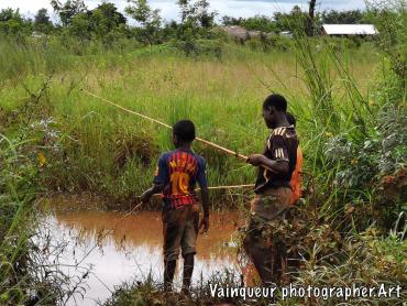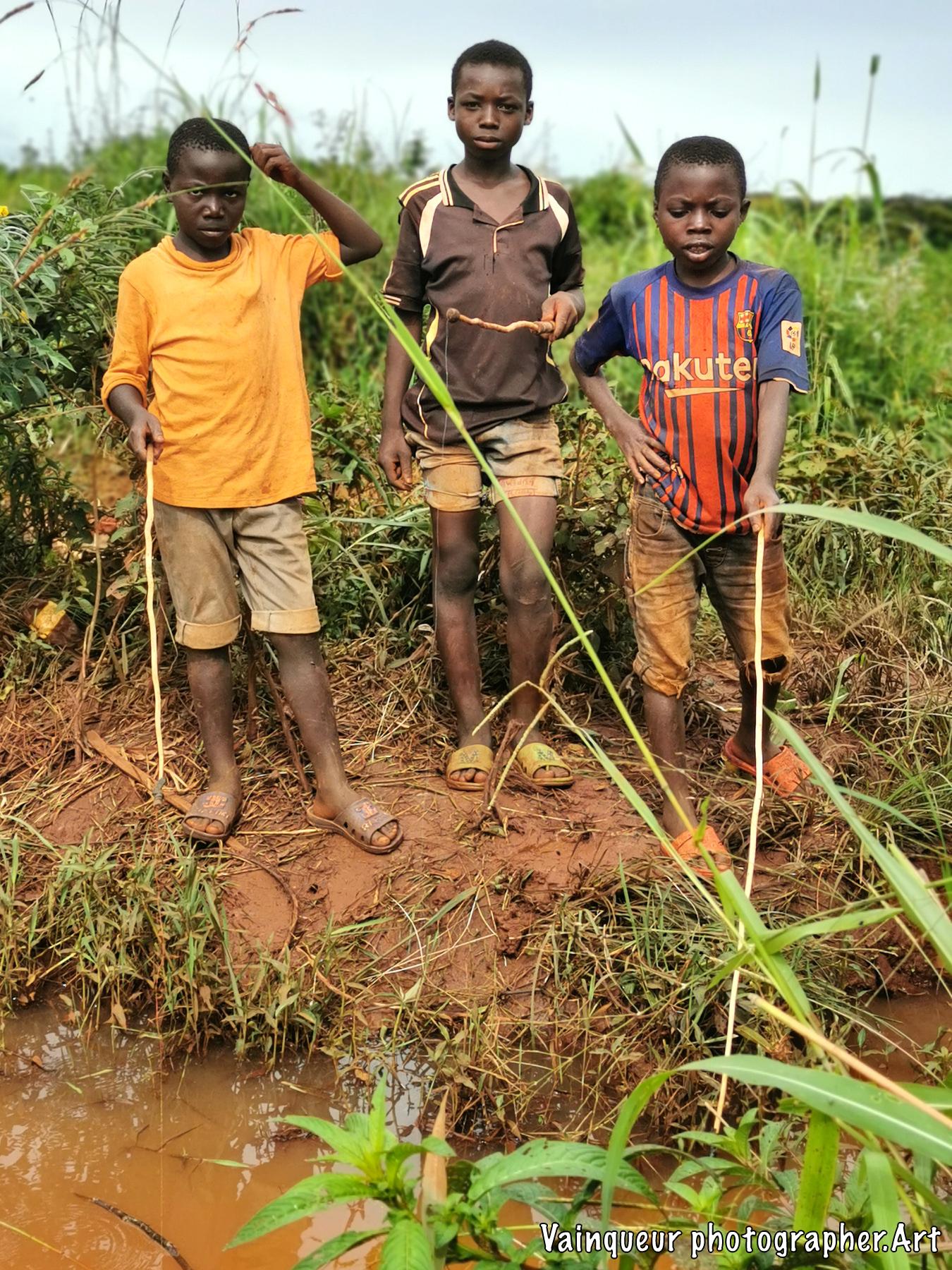 These three boys catch small fish in Nyarugusu river. After fishing these small fishermen find two options, either they will sell these fish or bring back home for family dinning. This little boy told us if he found several fish, he would sell some fish and other fish would be brought home. He add that he needs money to buy the sandals. It seems to be selling certain fish.