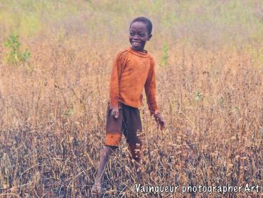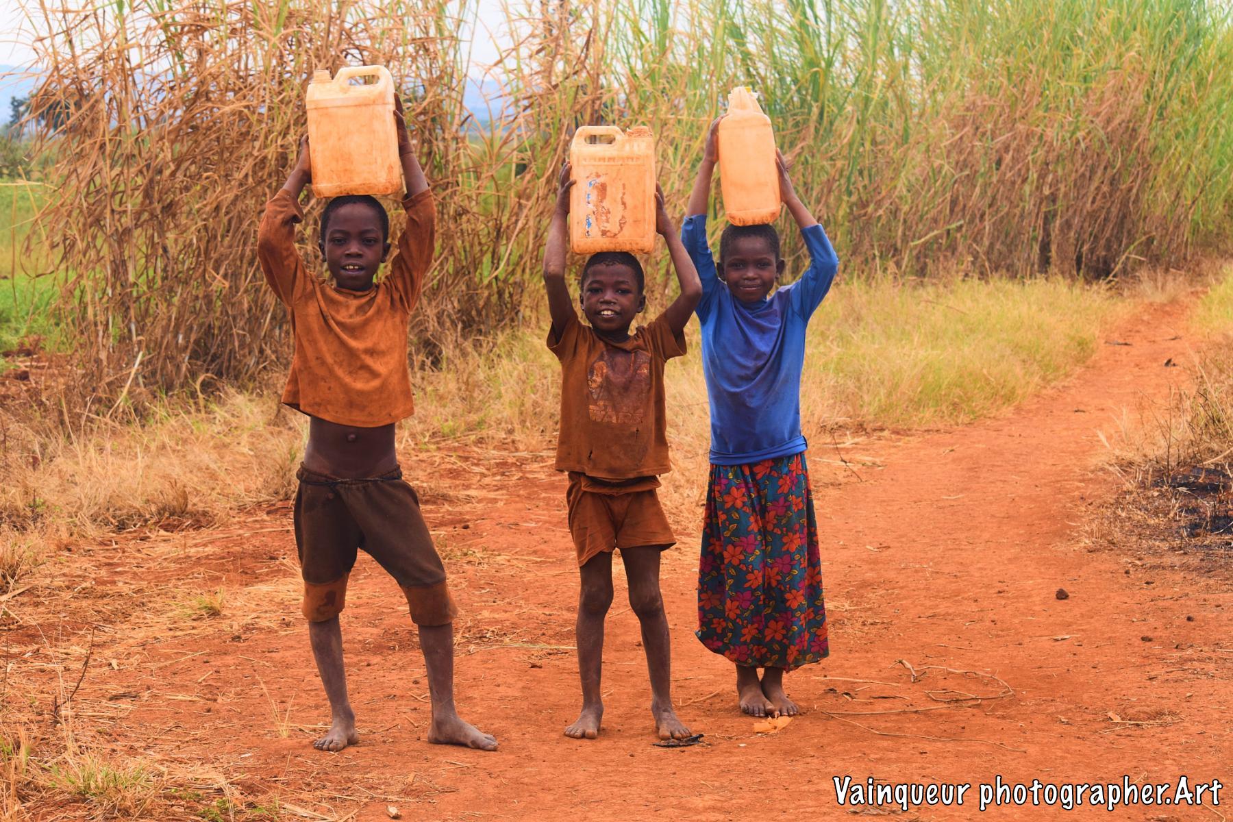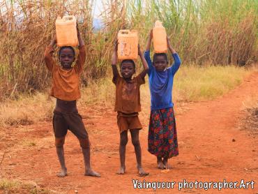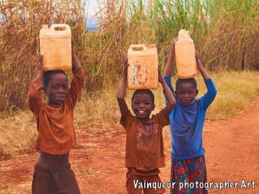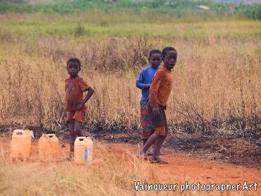 As I am always passionate about visiting African villages and bringing images of their daily lives, it was in the afternoon when I visited the refugee camp of Nyarugusu. When I arrived in a small bush in the middle of the garden I saw 3 refugee children running away in the mist, leaving their canister filling with water and escaping from me. I called them to join me and not to leave me, their big brother came to me saying "Oh you have the camera, we thought it's a gun ah haha".  Then they asked me how to handle the camera, I showed it to them and took pictures of each of them and finally they asked for a picture together.